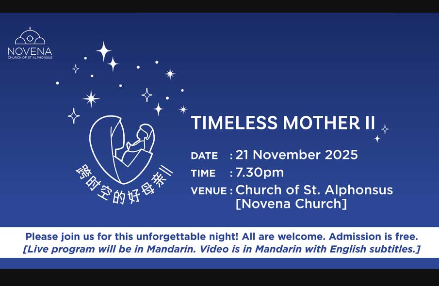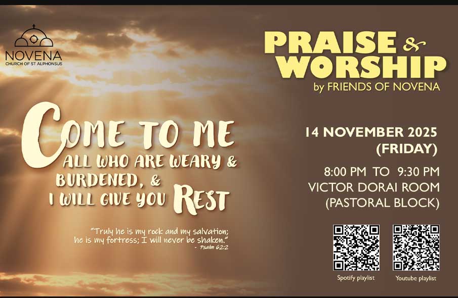 Upcoming events 21st Nov 2025 Timeless Mother II / 跨时空的好母亲 II 21st Nov AT 7:30pm - 8:30pm Past events 14th Nov 2025 Monthly Praise & Worship 8:00pm - 9:30pm 6th Sep 2025 A REDemptorist Concert 8:00pm - 9:45pm 5th Sep 2025 NOVENA YOUTH RALLY 6:00pm - 10:00pm 4th Sep 2025 Theological and Missiological Symposium 12:00am - 11:59pm 4th Sep 2025 Calendar of Events Leading to Annual Novena Procession 12:00am - 11:59pm 3rd Aug 2025 Family Carnival 11:30am - 6:00pm 26th Jul 2025 Grandparent’s Day 2:00pm - 4:00pm 11th Jul 2025 Monthly Praise and Worship 8:00pm - 9:30pm 13th Jun 2025 Praise & Worship – Love Poured out & Remains in Us 8:00pm - 9:30pm